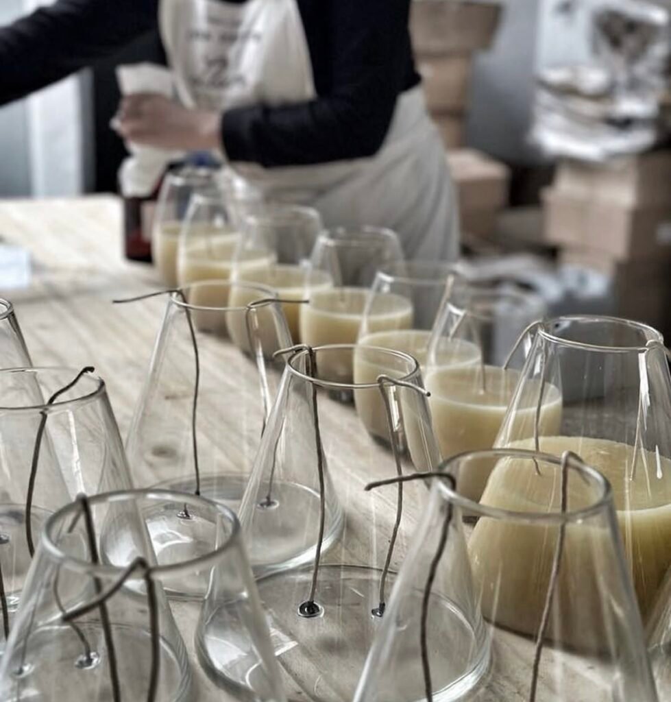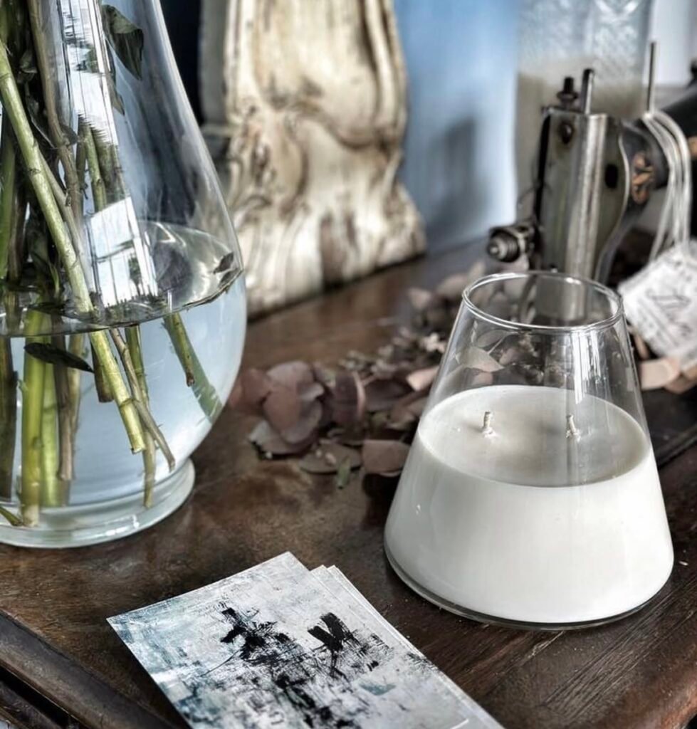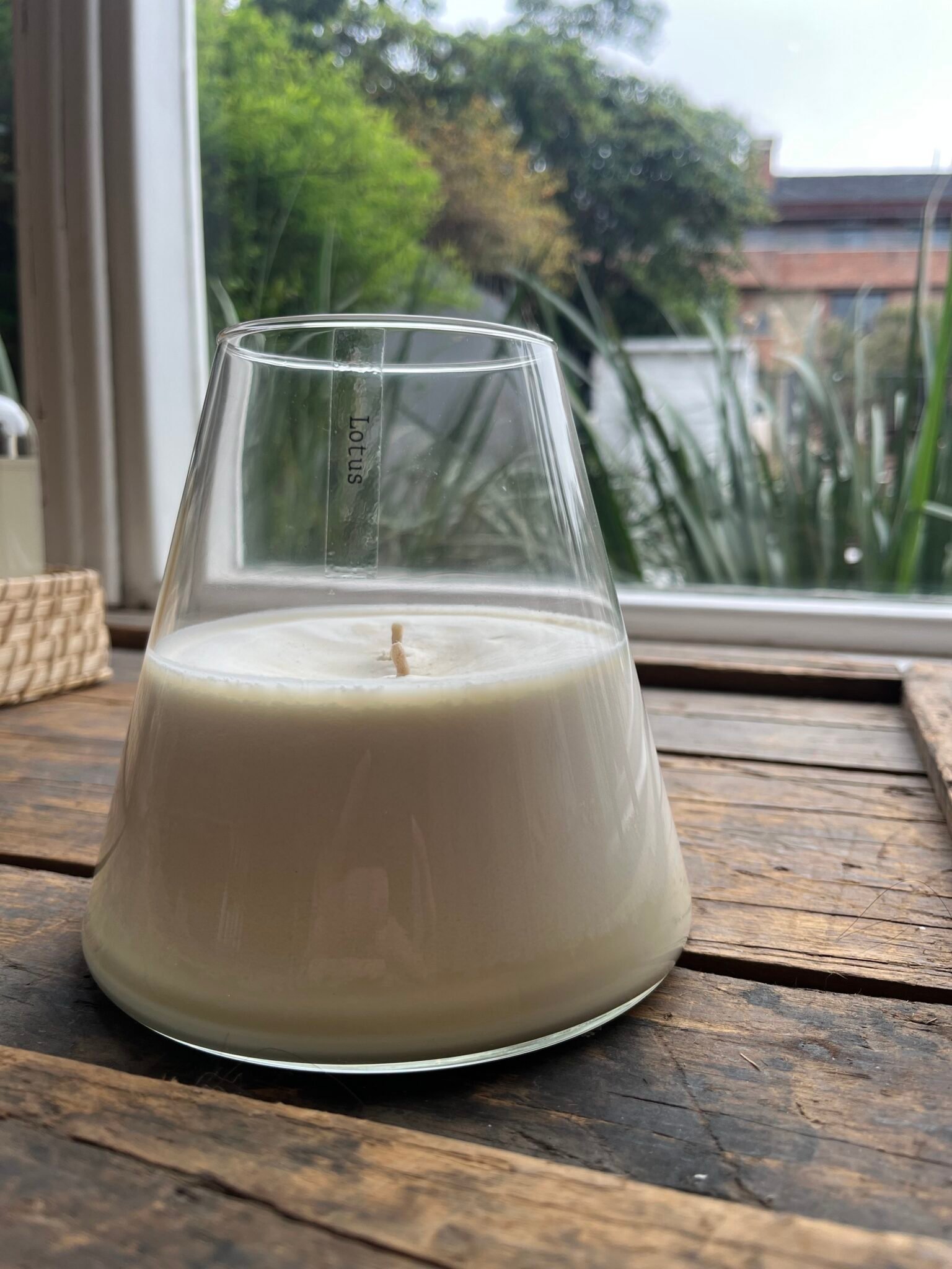 Envase simple y elegante con … cm de alto y … cm de diámetro y 2 pabilos de algodón.