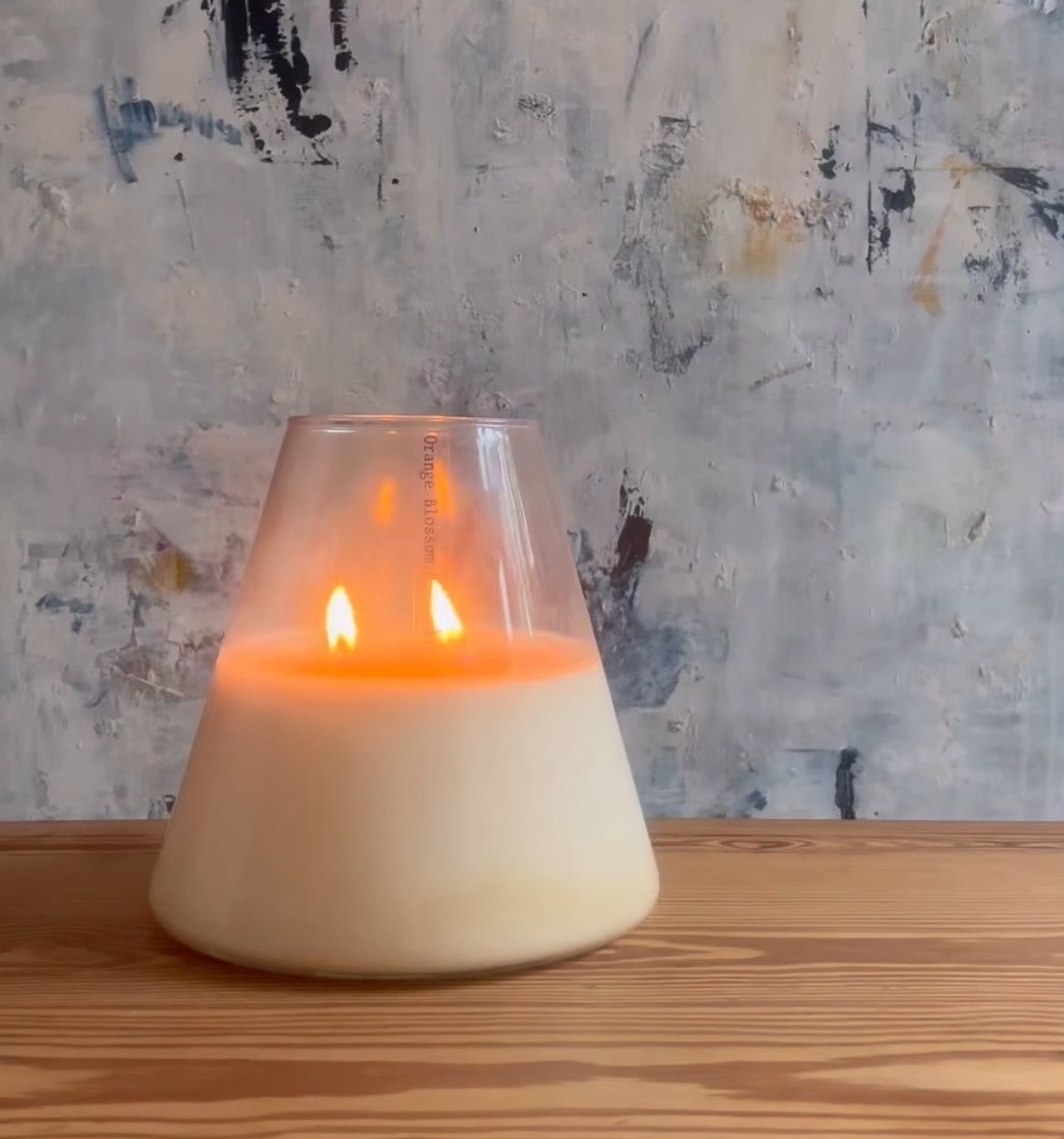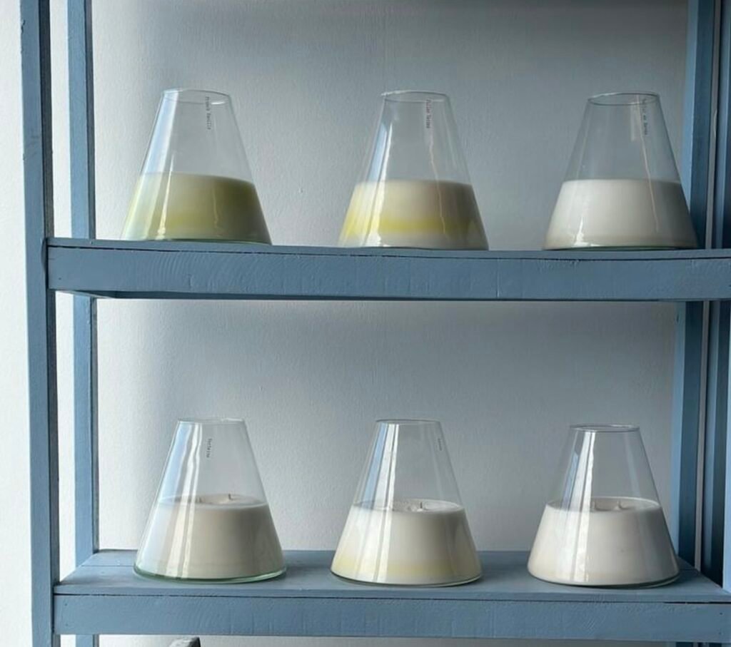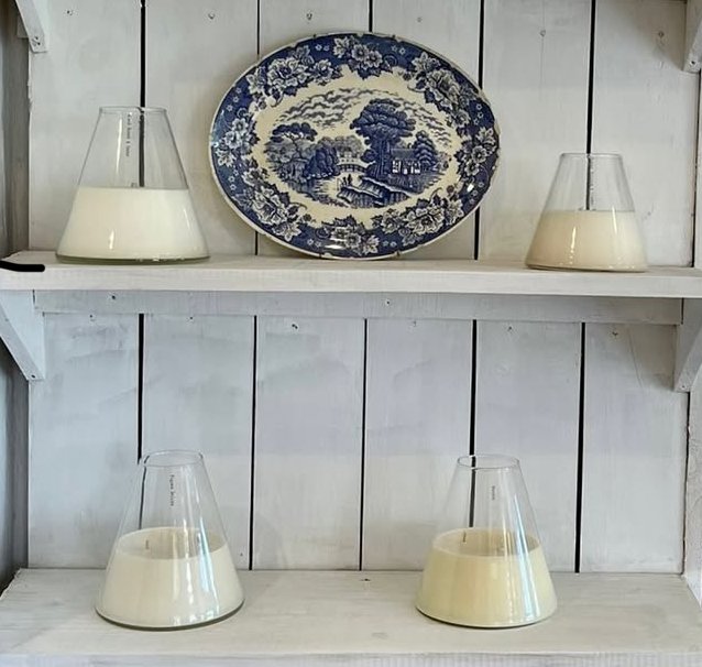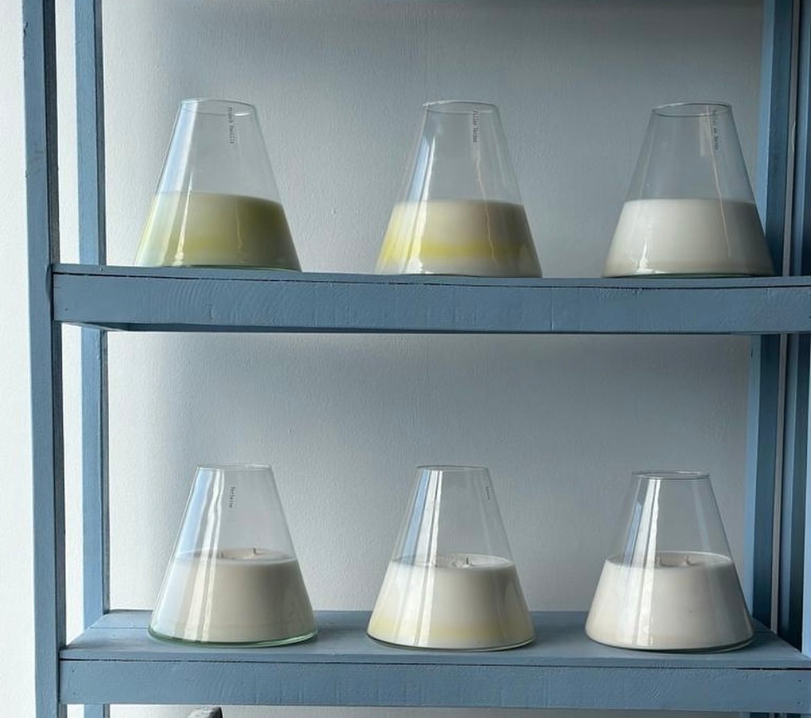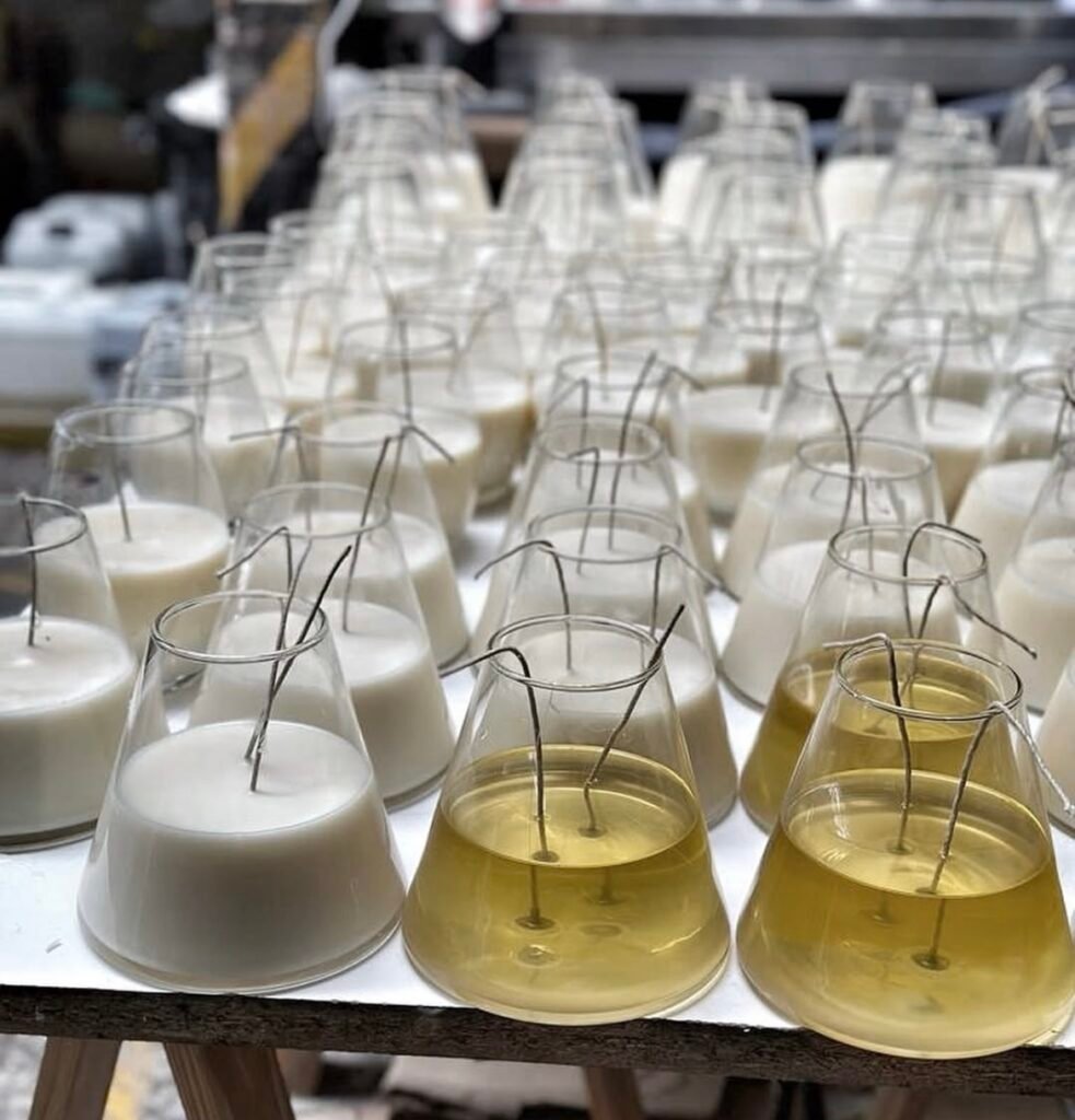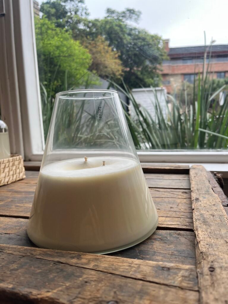Envase simple y elegante con … cm de alto y … cm de diámetro y 2 pabilos de algodón.